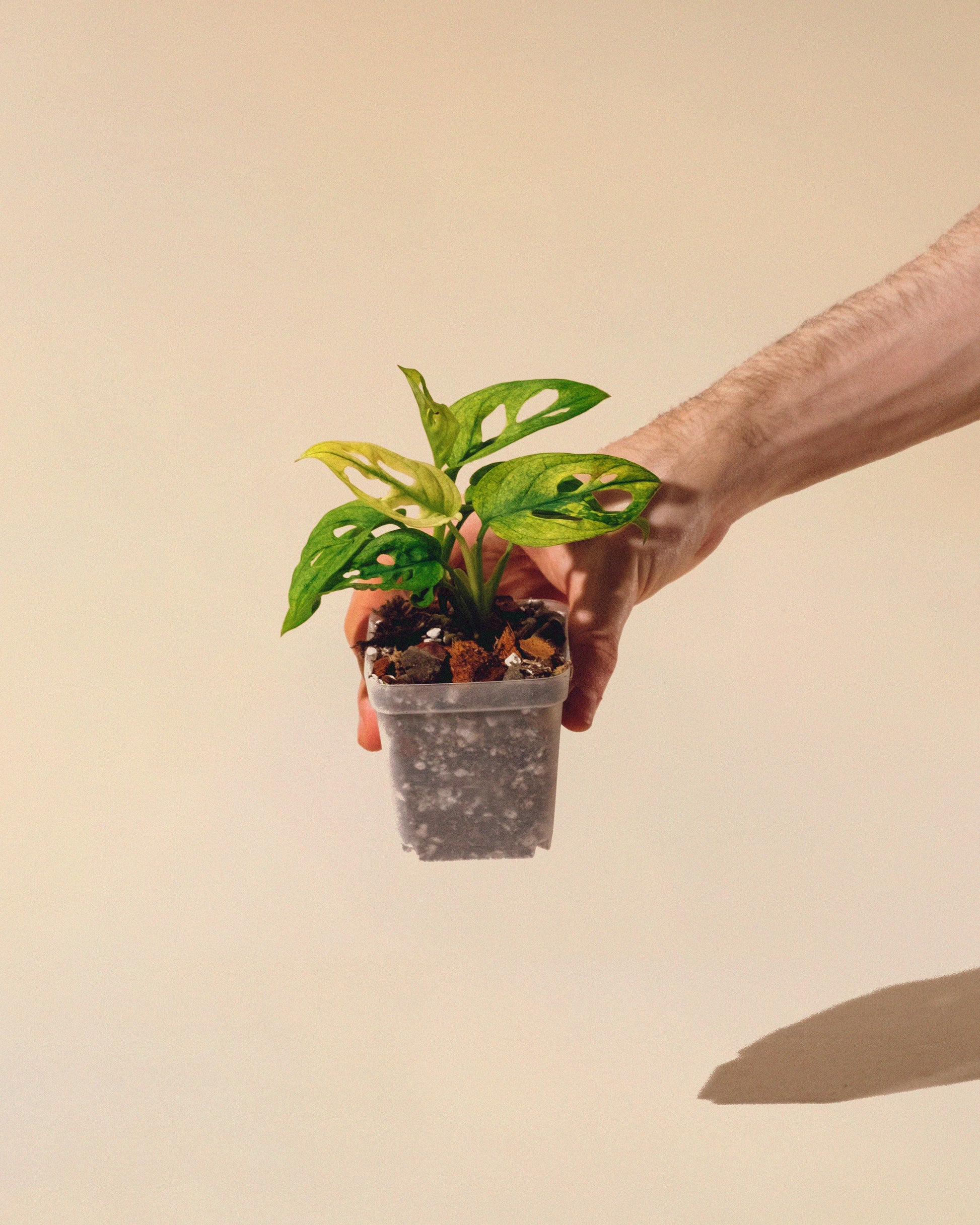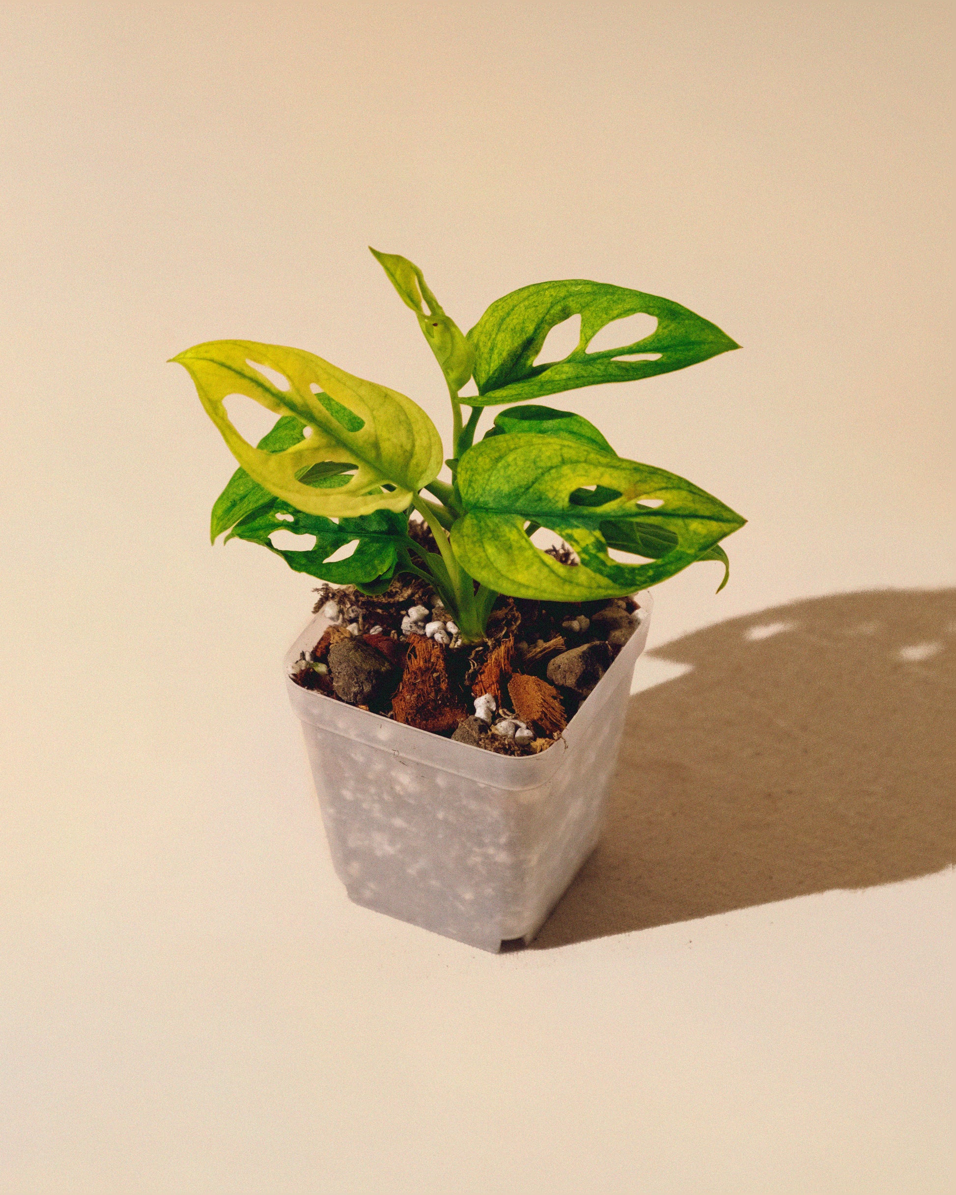 Monstera Adasonii Variegada (Archipielago) en maceta de 5cm con dos puntos de crecimiento.